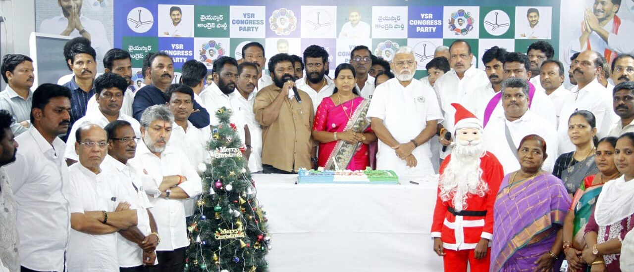 తాడేపల్లి వైయస్సార్ కాంగ్రెస్ పార్టీ కేంద్ర కార్యాలయంలో ఘనంగా సెమి క్రిస్మస్ వేడుకలు.సెమి క్రిస్మస్ వేడుకల్లో భాగంగా ప్రత్యేక ప్రార్ధనలు నిర్వహించి, అనంతరం కేక్ కట్ చేసిన మాజీ మంత్రులు తానేటి వనిత గారు, అంబటి రాంబాబు గారు, మాజీ ఎంపీ నందిగం సురేష్ గారు, ఎమ్మెల్సీలు మొండితోక అరుణ్ కుమార్ గారు, లేళ్ల అప్పిరెడ్డి గారు, కొమ్మూరి కనకారావు గారు, ఏ నారాయణమూర్తి గారు, పలువురు వైయస్సార్సీపీ నేతలు, కార్యకర్తలు.అనంతరం కార్యకర్తలనుద్దేశంచి మాట్లాడిన వైయస్సార్సీపీ నేతలు.